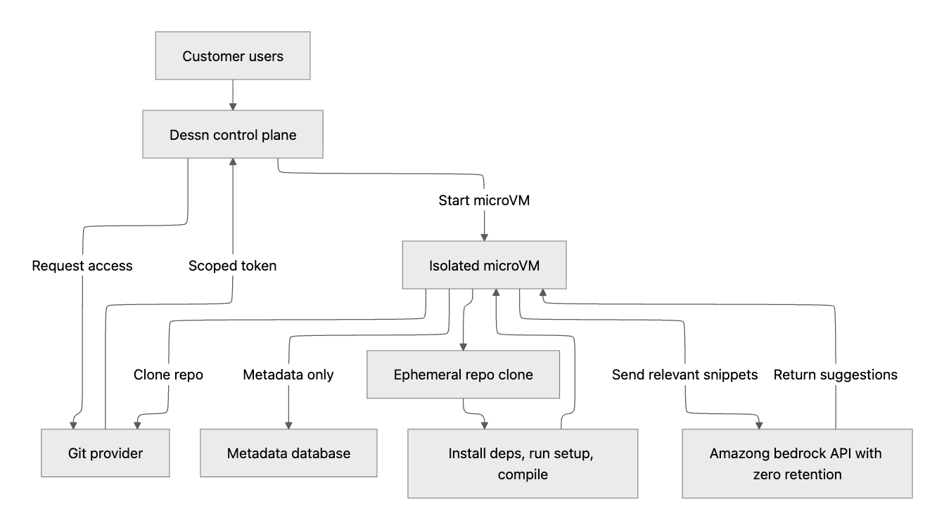 As the VM works, it sends back derived metadata only (like component structures, tokens, and prototype definitions) to the Dessn control plane. Your raw code never leaves the VM. The microVM can be destroyed at any time, wiping its entire filesystem.